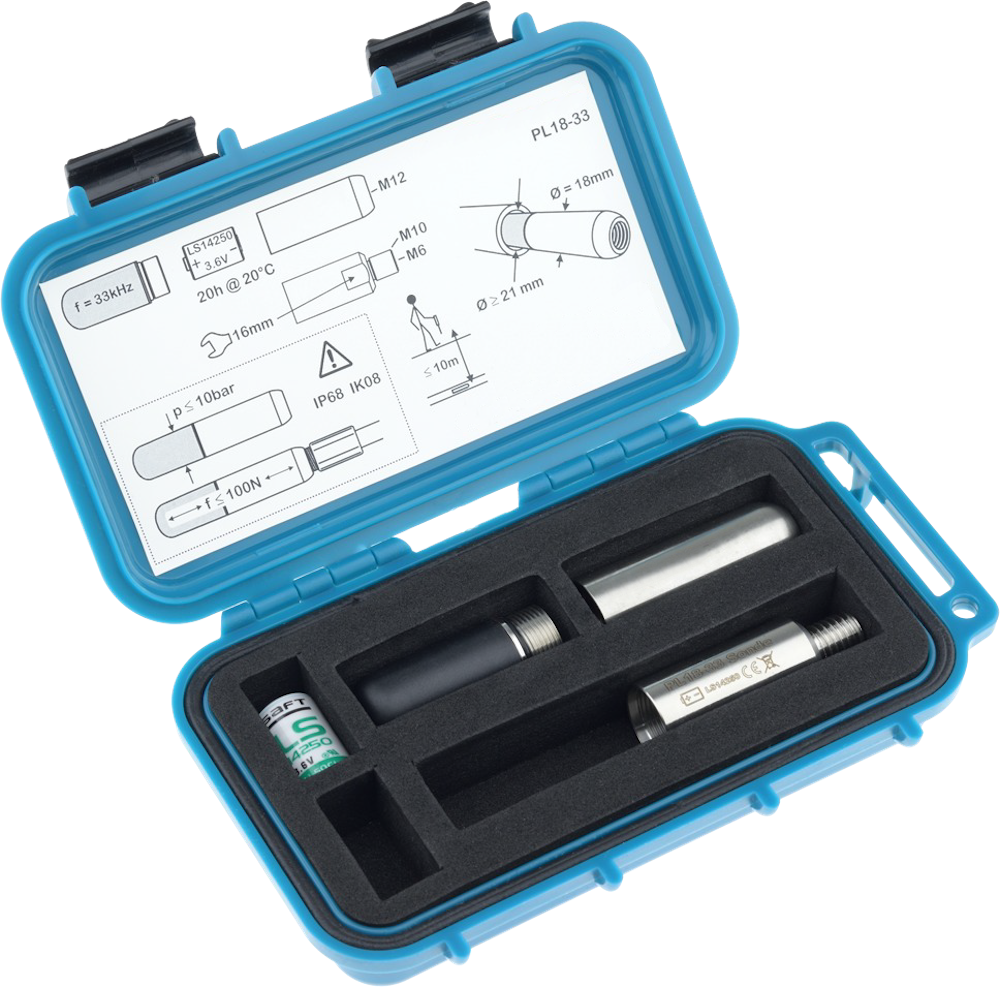 18mm Ortungssonde mit 32.8kHz., Länge 85mm, Ortungstiefe in freien Feld bis zu 10m. Lieferung in der Kunststoffbox inklusive Batterie LS14250 3.6V Lithium. Mit Anschluss M10 männlich und M12 weiblich (für 7,4mm & 11mm Schiebeaal / Schubkabel). Ortbar mit den Geräten der vScan- und vLoc3-Serie.